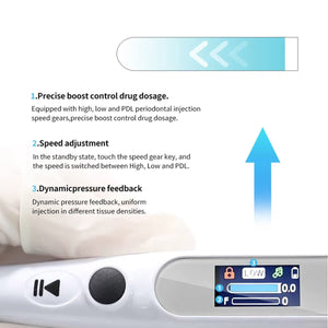 2. Precise boost control drug dosage. Equipped with high, low and PDL periodontal injection speed gears, precise boost control drug dosage.