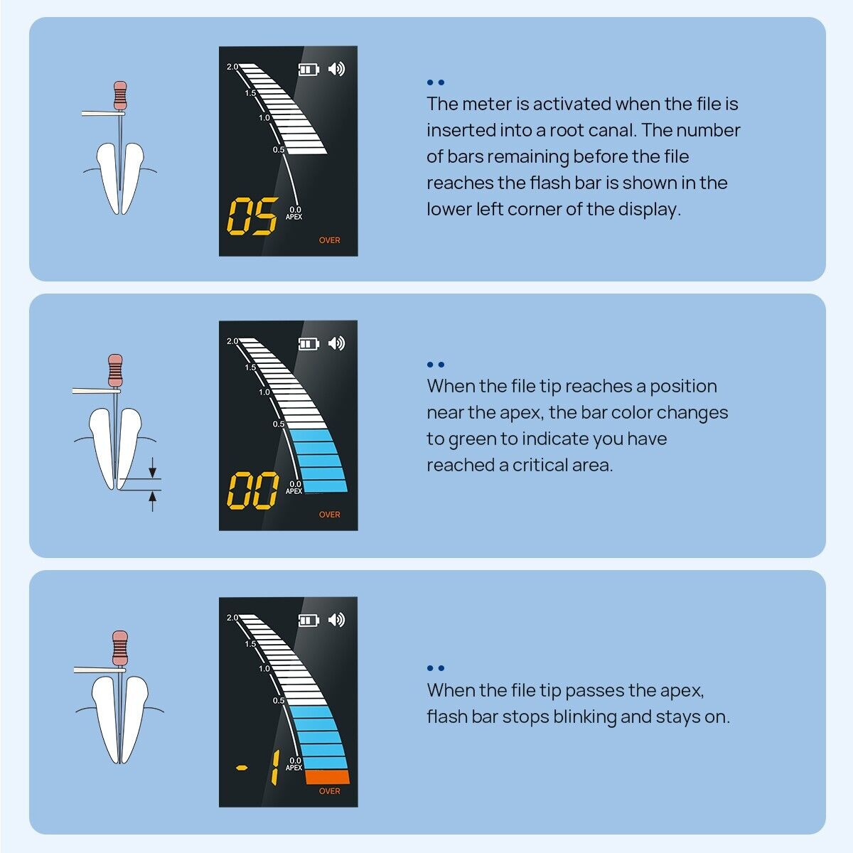 e) Buzzer alert: The buzzer will alert when the file is less than 2mm closed to the apex.
