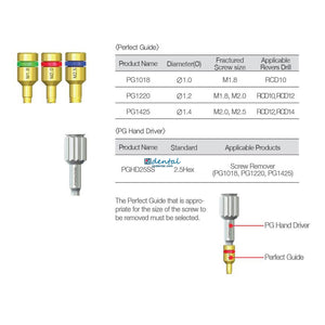 - The Perfect Guide acts as a Guide for the Reverse Drill. It is used when the screw is fractured at the lower part of the female screw inside the Fixture. It is connected to PG Hand Driver and is directly applied to the Fixture female Screw.