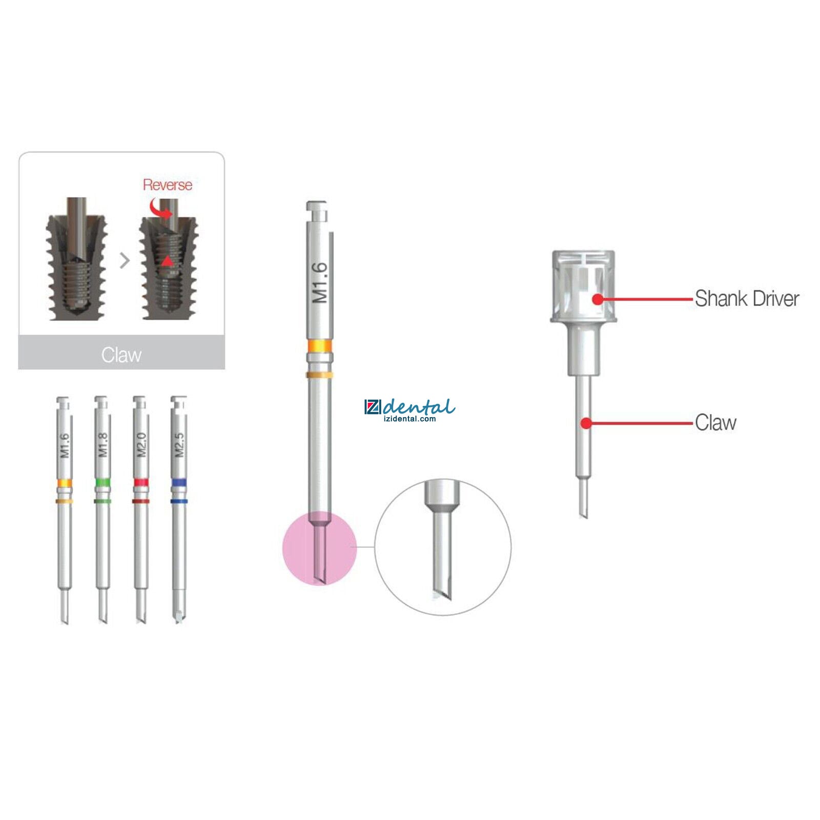 This is a surgical tool designed to remove screws that have become fractured inside a fixture. After selecting the appropriate size for the screw to be removed, the Claw is used by connecting a guide to the fixture (Conical/Internal/External Guide). Then, it is connected to the Shank Driver, and the fractured screw can be removed by manually rotating it in the reverse direction. If the fractured screw cannot be removed using the Claw, it must be removed using the Reverse Drill and Screw Remover.