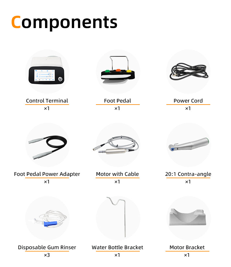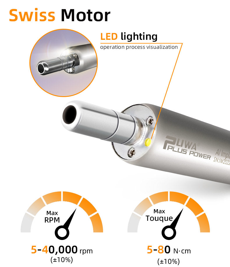 · Swiss motor of dental implant device offers 5 to 40000 rpm(±10%) speed range and 5 to 70 n·cm (±10%) torque, which can be used in all kinds of treatment and make cutting bone more efficient and accurate.