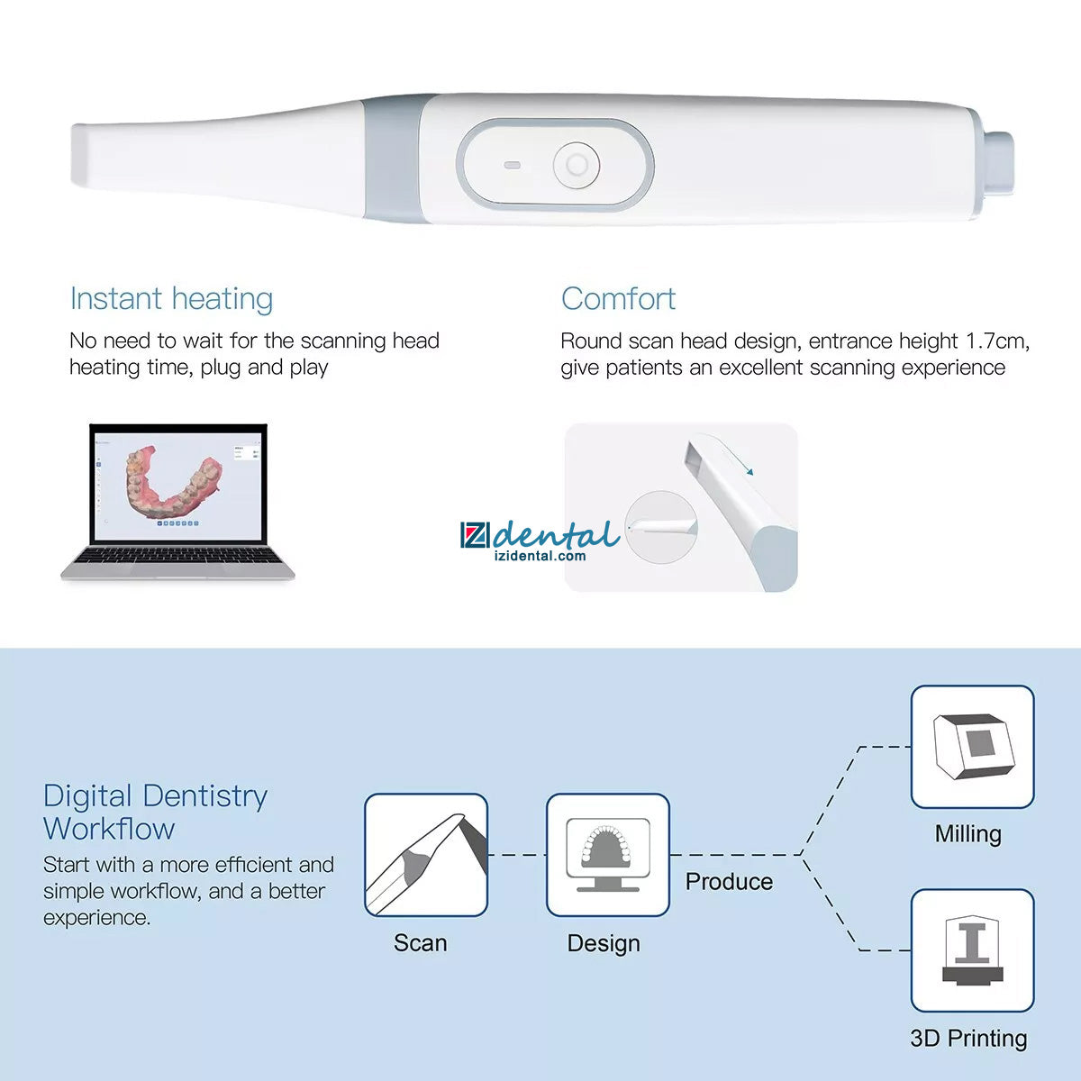 - AI and Motion Control: Integrated AI technology filters out unnecessary data (such as tongue and lips) for smoother scans. Motion control allows the scanner to rotate while avoiding contact during scanning.