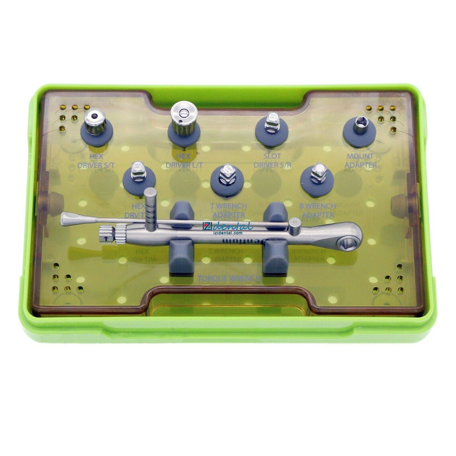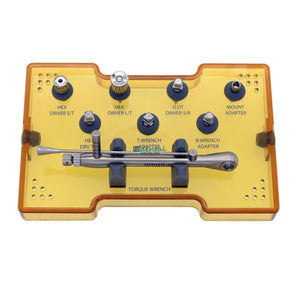 This kit includes a torque wrench, a screw abutment placement tool, 1.27 hex drivers, and implant indicators.