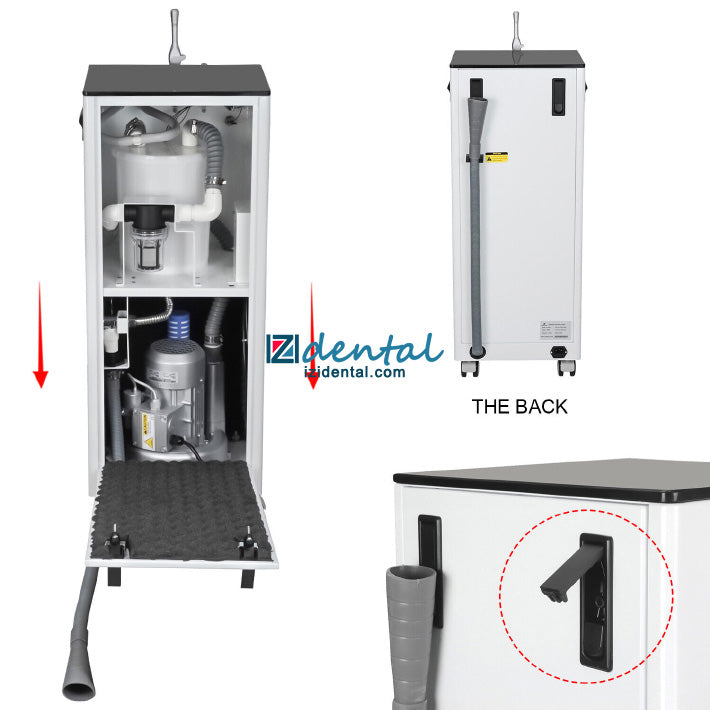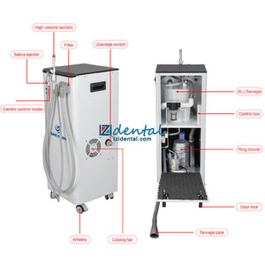 3. It is designed to facilitate all types of dental treatments such as surgical, implant, and orthodontic procedures with its permanently powerful suction ability. It can be easily located next to the dental chair and moved to another place freely with wheels.