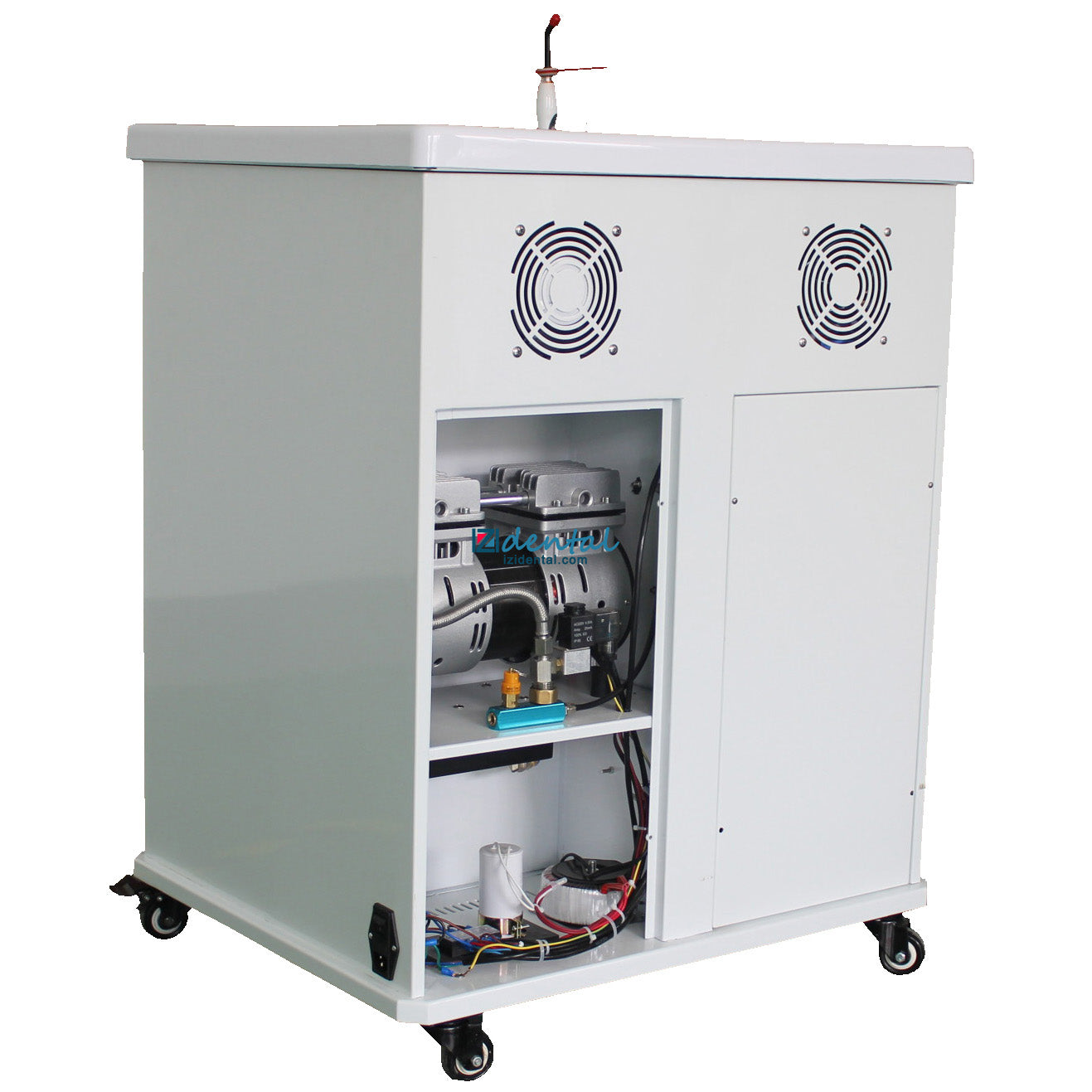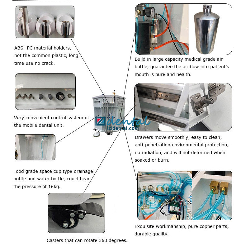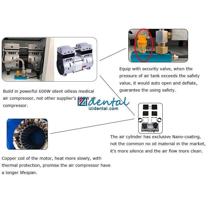 • The rectangular shape on the back of the unit maximizes the use of corner space, saving your clinic area. It includes a built-in dental air compressor and tank, offering the same functionality as an integrated dental chair.