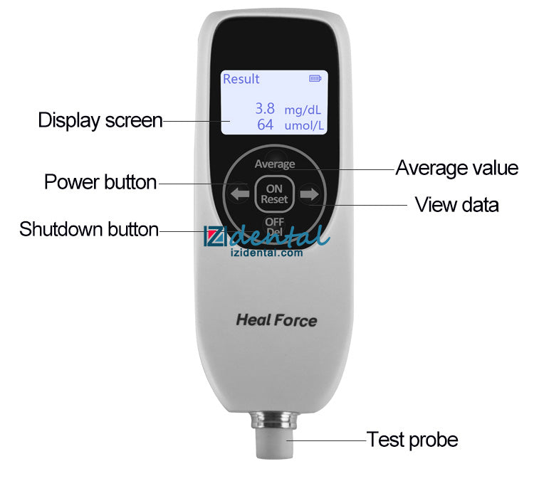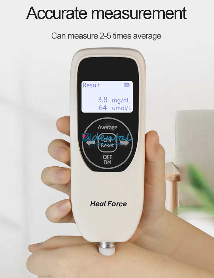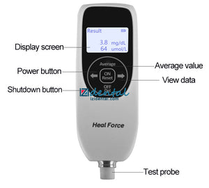Simultaneous display of measurement units: displaying mg / dL & µmol / L in the meantime. Data Storage: 200 groups of measurement data