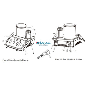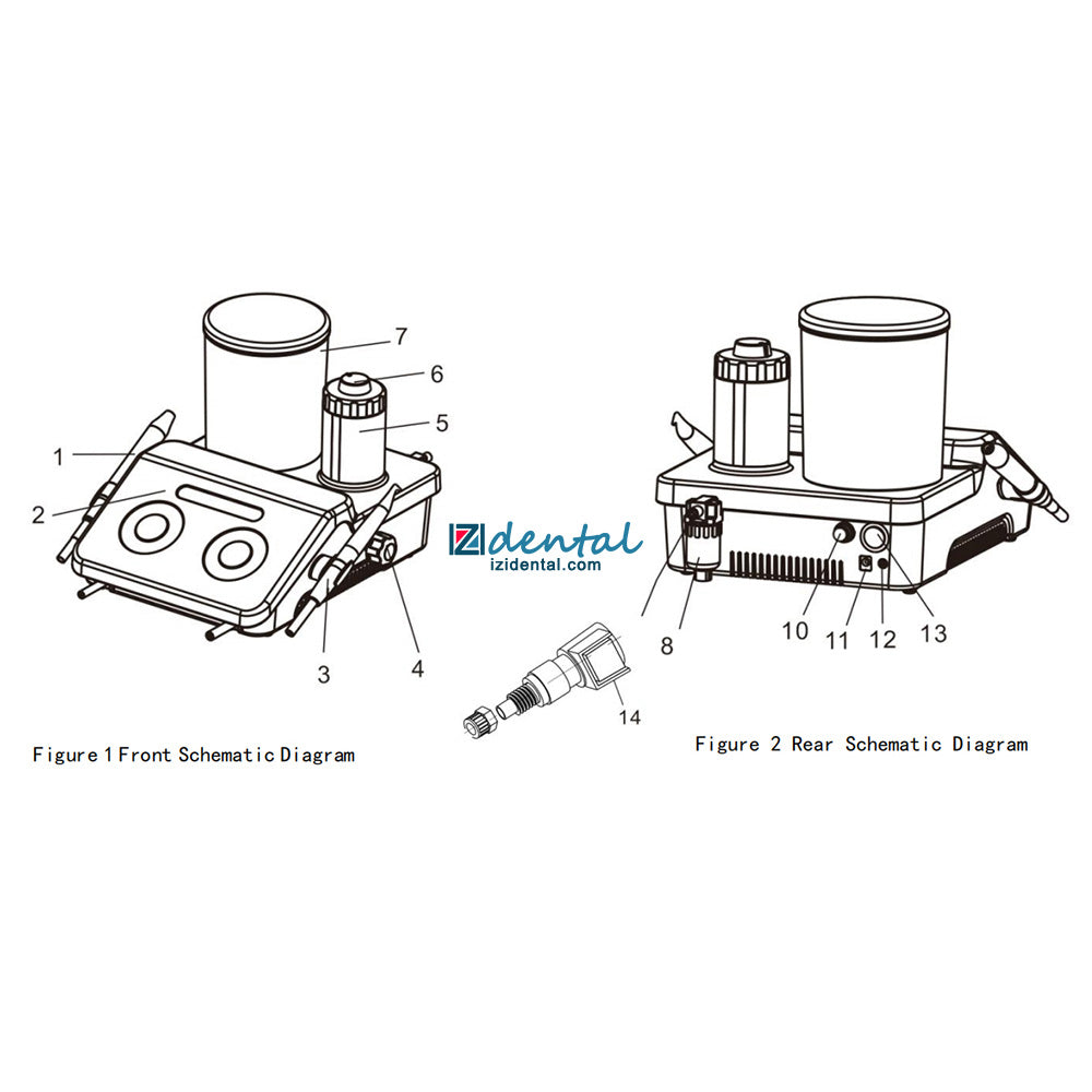 4. Air pressure control knob: adjust the air pressure under air polishing mode 9. Air intake 14. Check valve quick coupling