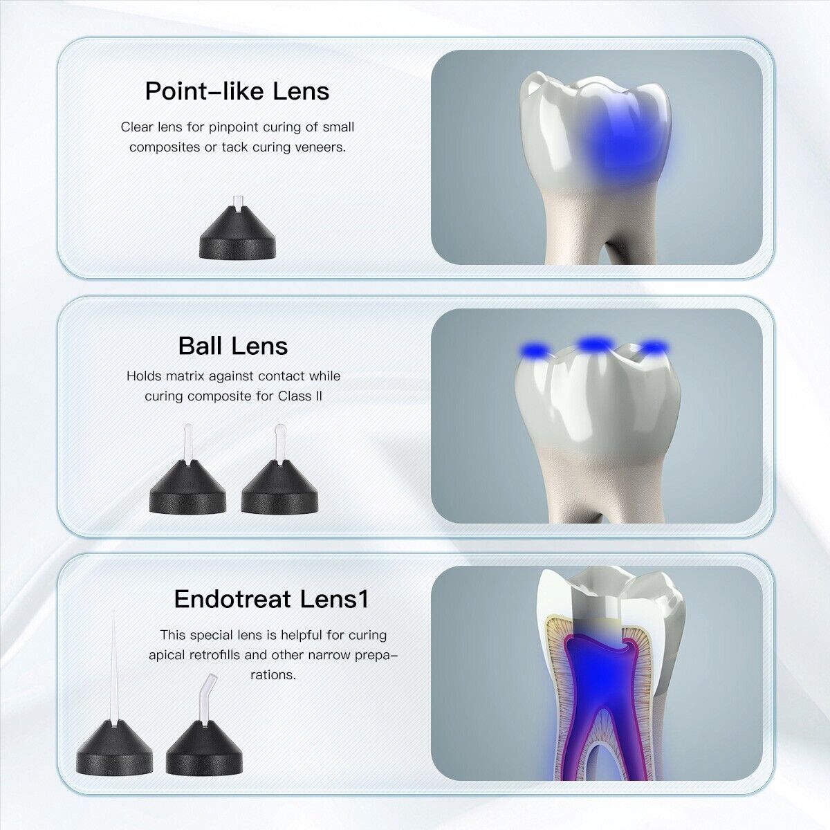 ① Point-like Lens: Clear lens for pinpoint curing of small composites or tack curing veneers.