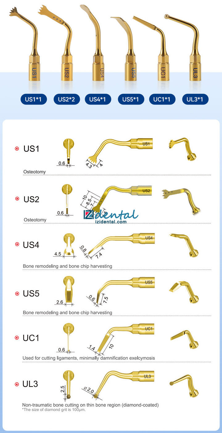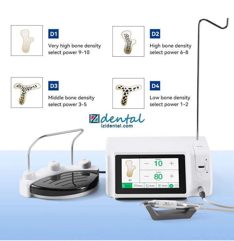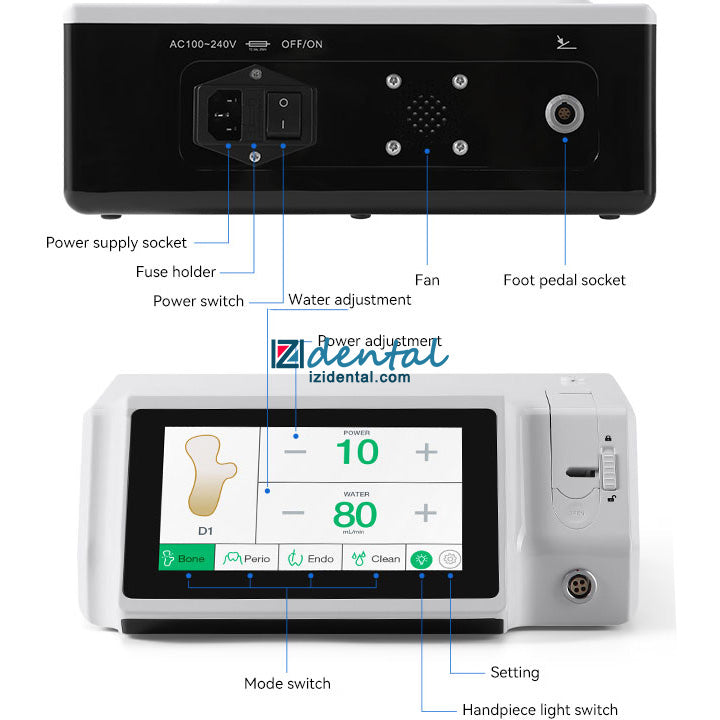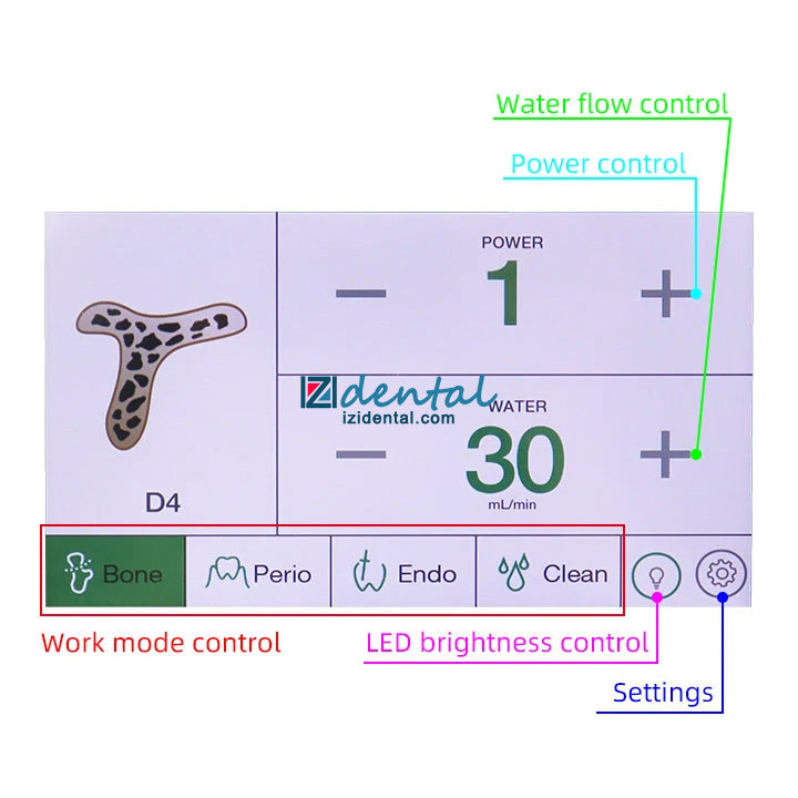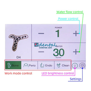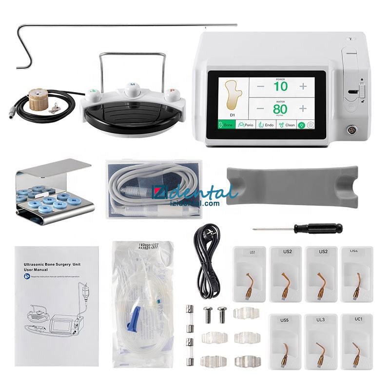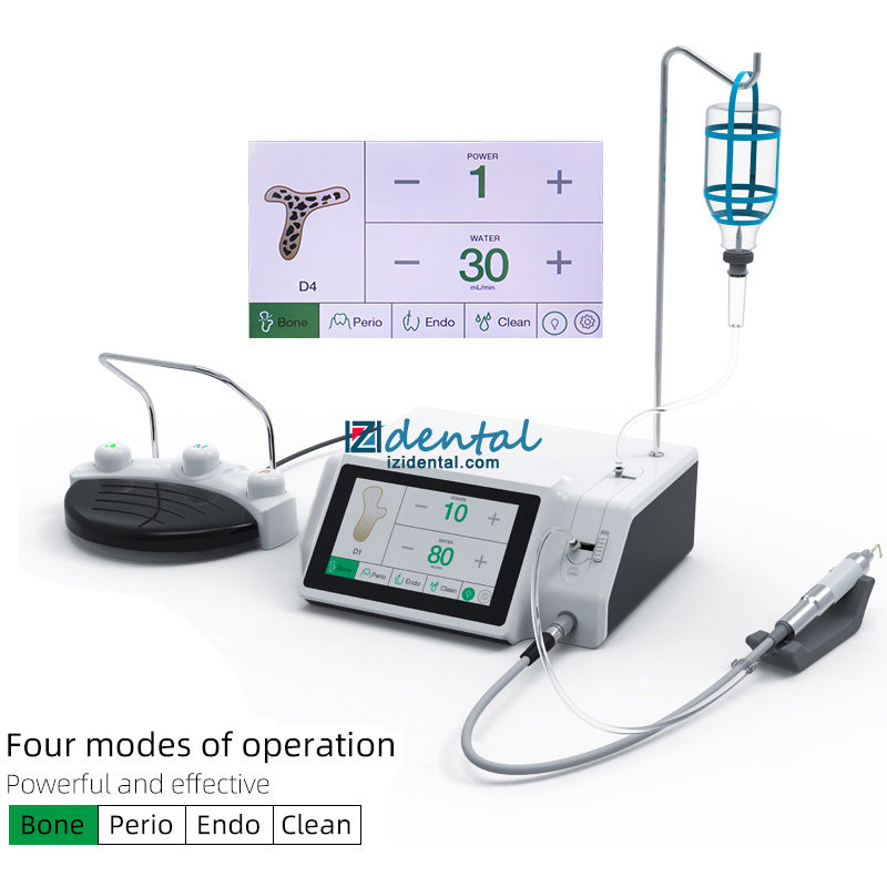 1. Multifunctional in one. Contains bone cutting, periodontal, root canal, and cleaning functions. 4 program modes, can match 6 different working tips.